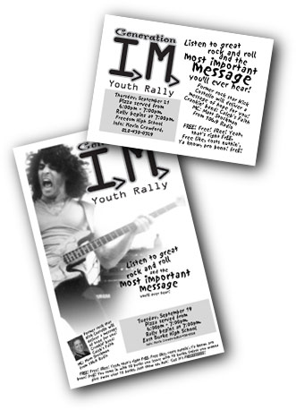 This mini outreach event introduces lost kids to the greatest ‘Instant Message’ they will ever hear, the Gospel of Jesus Christ and how God wants a personal love relationship with them. Can include teen testimonies, prize give-aways, music by a popular local Christian band and a relevant presentation of the gospel by Nick. Area churches join together for this free event to reach teenagers with the Gospel. Public school friendly promotion supplied.